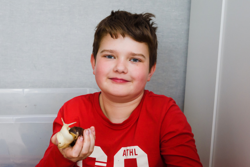 Pašlaik Mariuss aprūpē piecus Āfrikas gliemežus. «Gliemeži dzīvo desmit gadus,» gandrīz no sliekšņa paziņo Mariuss, tikko pārradies no mācībām. Viņš lietišķi sāk sakopt gliemežu mājvietu. «Jāmaina zeme. Tas ir substrāts, tūlīt paradīšu. Paņemu ūdeni, samērcēju substrātu, lai izšķīst, un lieku gliemežiem,» zēns stāsta un lietpratīgi apskata substrāta iepakojumu - neesot vislabākais. Mamma nāk palīgā un piedāvā ūdens drošāku trauku. Kamēr Mariuss stāsta un rāda, kā jāsagatavo zeme gliemežu mītnei, istaba kļūst vairāk nekā netīra. Margarita mierīgi vēro. «Kad es tīru gliemežus, man patīk ļoooti netīram palikt,» puika pavēsta. Mamma nopūšas.