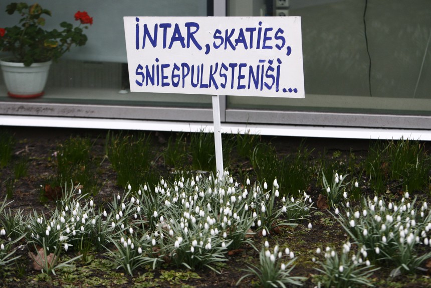 Pie Dailes teātra dienesta ieejas ziedošo sniegpulkstenīšu dobē redzams savdabīgs plakāts – kolēģu nedaudz sarkastisks sveiciens aktierim Intaram Rešetinam, kas veltīts viņa «saldajai» intervijai kādā sieviešu žurnālā un ierakstiem sociālajā tīklā «Twitter.com».