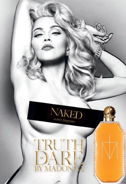 54 gadus vecā Madonna jauno smaržu "Truth or Dare: Naked" reklāmas kampaņas fotogrāfijā redzama gandrīz kaila. Viņas kailās krūtis piesedz vien melns taisnstūris.