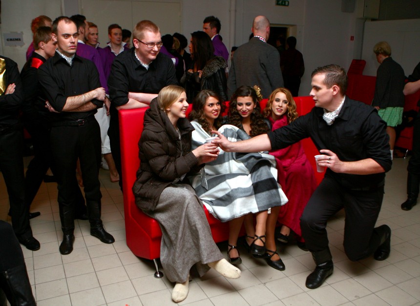 Vienīgās telpas, kurās nevaldīja aukstums, bija koru mēģinājuma istabas. Koru vadītāji šīs telpas pameta tikai īsi pirms savas gaidāmās uzstāšanās un grimēties devās, ietinušies biezās virsdrēbēs. «Šajās telpās nekas nav noticis jau ilgāku laiku, tās ir bijušas neapdzīvotas. Diemžēl mums neizdevās telpas piesildīt uz pirmo šova parraidi. Nelīdzēja arī papildu sildītāji. Mēs šo problēmu aktīvi risinām, un cerams, šosvētdien telpas jau būs pietiekami siltas,» sarunā ar »VZ« radušos situāciju komentēja šova producente Ilze Ūdre.