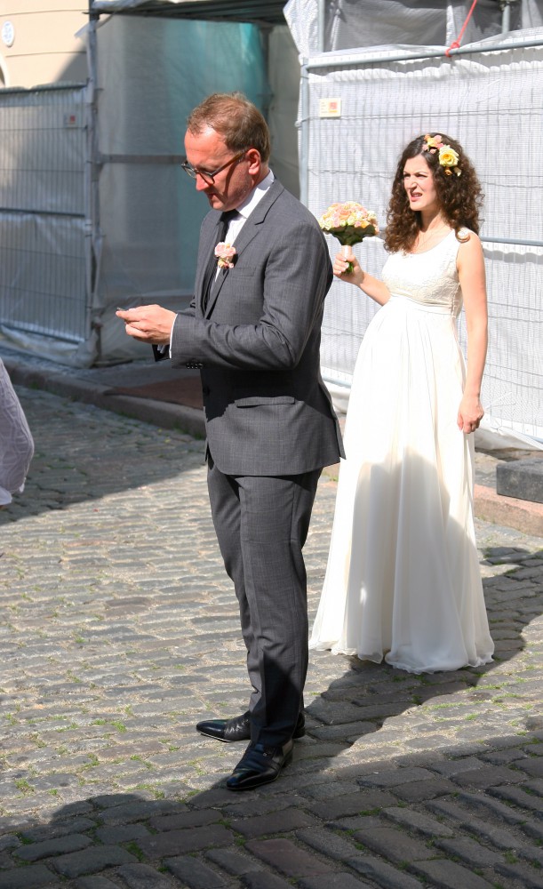 Svētdien ap trijiem pēcpusdienā nelielā viesu pulkā laulības ostā iestūrēja pazīstamais režisors Ivo Kalpenieks (viņš saņēmis vairākas «Lielā Kristapa» balvas, bet pēdējos gados vairāk zināms kā dažādu populāru zīmolu reklāmu režisors) un viņa gados krietni jaunākā līgava Daiga Daugule. Līgava bija tērpusies vienkāršā baltā kleitā, matus rotājusi ar krēmkrāsas un dzelteniem rožu ziediem. Līgavas kleita šoreiz izpalika bez tradicionālās korsetes daļas, jo Kalpenieka kundze ir mātes cerībās, un jau augusta beigās pasaulē jānāk abu kopīgajam mazulim. Uz laulības norises vietu abi tika atvizināti lepnā antīkā spēkratā. Viesu vidū galvenokārt dominēja jaunās sievas piederīgie, jo, pēc »VZ« rīcībā esošās neoficiālās informācijas, daudzi režisora ģimenes draugi uz kāzām neieradās, jo bija šokēti par to, kā vīrietis jaunās meitenes dēļ izrīkojies ar savu līdzšinējo ģimeni.