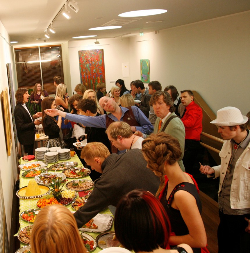Uz galdiem netrūka uzkodu un šampanieša, turklāt, par spīti teju trīs stundu ilgajā Eirovīzijas maratonā nobadināto (un izslāpušo) apetītei, vismaz pārtikas klāsts pat negrasījās izbeigties. Bagātīgi, kā jau Ventspilī tas ierasts.