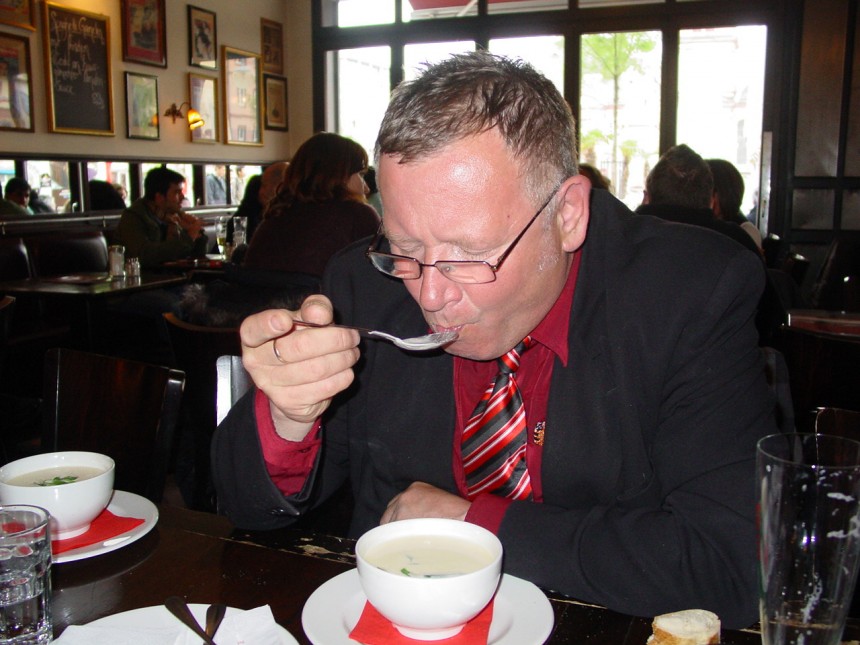 Gunāram Meijeram bija noteikts tuvākajās dienās pēc zobu ielikšanas neēst neko cietu, un tas nozīmēja, ka nācās atteikties pat no labi izceptas gaļas. Kad Gunārs Meijers un Normunds Jakušonoks ar kluba «Četri balti krekli» vadību devās pirmajās vakariņās Manheimā, izvēloties glaunu krogu, Meijers patiešām bija ļoti piesardzīgs ēdiena izvēlē un pasūtīja sparģeļu biezzupu. Vai nu sparģeļi bija pārāk cieti, vai arī jaunieliktie zobi nekādi nespēja sadraudzēties ar vāciešu nacionālo ēdienu, taču Meijers, ēdot zupu, izlauza zobu! Šis incidents gan Meijera prieku par hokeja čempionātu nav mazinājis. Zobs smuki sapakots vešanai uz mājām, un uzreiz pēc čempionāta gan jau mūziķa dentistam nāksies skaidrot, kādēļ viņa darbs nav izturējis pat sparģeļu biezzupu, kas, runājot «Četru baltu kreklu» līdzīpašnieka Aināra Tamisāra vārdiem, nemaz tik bieza nav bijusi.