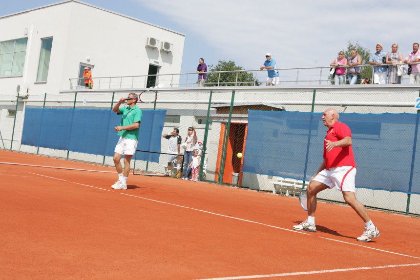 «Ja uzvarēsim, Nikolajevs pēc spēles tev par godu sacerēs īpašu dziesmu,» hokeja leģendu Helmutu Balderi-Sildedzi (no labās) tenisa laukumā uzmundrināja viņa pārinieks uzņēmējs Jānis Naglis. Abi mērojās spēkiem ar populāro krievu komponistu Igoru Nikolajevu un daiļslidotāju Aleksandru Žuļinu.