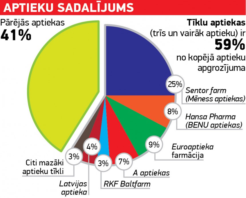 Tīklu aptiekas (3 un vairāk aptiekas) ir 59% no kopējā aptieku apgrozījuma (%)