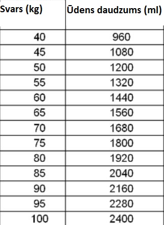 Lai noskaidrotu cik daudz ūdens jāuzņem tev, skaties pie raksta pievienoto tabulu. Tāpat arī jānorāda, ka, lai veiksmīgi zaudētu liekos kilogramus, ūdens jādzer pareizi.