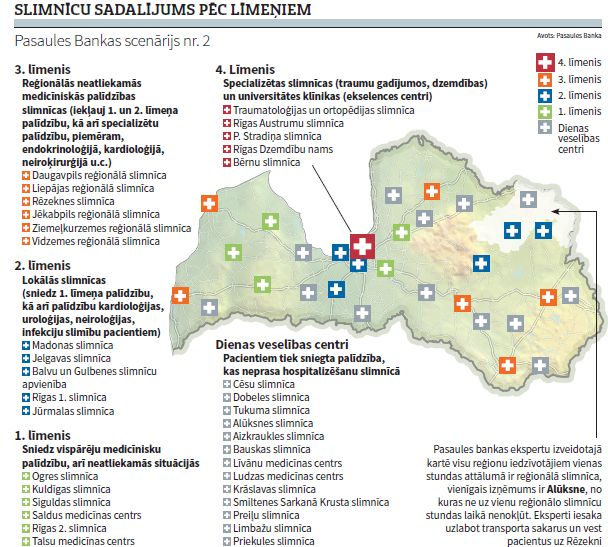 PB savā pētījumā piedāvā divus dažādus scenārijus slimnīcu sadalījumam pa līmeņiem. Vienā no tiem ir četri līmeņi, bet otrā - faktiski pieci līmeņi, no kuriem viens ir dienas centri (ironiski Latvijas Slimnīcu biedrības vadītājs Jevgēņijs Kalējs tos nosauca par «jogas centriem»). Abos scenārijos vairākām slimnīcām savs darbs būtu jāmaina jeb faktiski jāslēdz uzņemšanas nodaļas, un tajās diennakts pacientu pieņemšana vairs nenotiktu. Tas vislielākajā mērā attiecas uz lokālajām slimnīcā. Reģionālās slimnīcas savu statusu saglabā abos scenārijos.