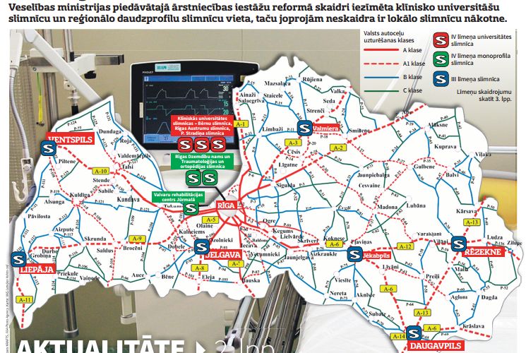 Veselības ministrija iepazīstinājusi valdību ar ārstniecības iestāžu kartējumu un attīstības reformu, kurā piedāvā visas slimnīcas sadalīt četros līmeņos un trešajam slimnīcu līmenim noteikt vēl sīkāku sadalījumu.