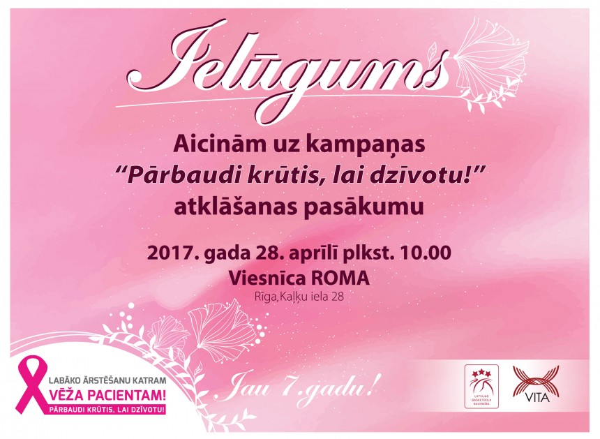Krūts veselības informatīvās kampaņas “Pārbaudi krūtis, lai dzīvotu!” atklāšana notiks šo piektdien, 2017. gada 28. aprīlī, viesnīcā “Roma” (Kaļķu iela 28). Šogad kampaņas ietvaros īpaša uzmanība tiks pievērsta ne tikai nepieciešamībai regulāri veikt krūšu pārbaudes, bet arī tam, cik pieejama ir katram pacientam piemērotākā efektīvā ārstēšana.