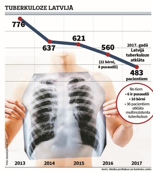Pagājušajā gadā tuberkuloze atklāta 483 pacientiem, kas ir par 14 procentiem mazāk nekā 2016. gadā. Jaunatklāto gadījumu skaits samazinās katru gadu, jo 2015. gadā tuberkuloze atklāta 621, 2013. gadā - 776, bet vēl agrāk katru gadu tuberkulozi atklāja vairāk nekā tūkstoš cilvēkiem. Tomēr, pēc speciālistu domām, «svinēt uzvaru cīņā pret šo bīstamo slimību ir pāragri», jo saslimstības ziņā Latvija ir vienā no vadošajām vietām Eiropas Savienībā. «Lai arī Latvijā ar katru gadu saslimstība ar tuberkulozi samazinās straujāk nekā vidēji Eiropas reģionā, tomēr mūs gaida ļoti daudz izaicinājumu, lai sasniegtu mērķi - pilnīgi izskaust tuberkulozi sabiedrībā līdz 2030. gadam,» saka ārste Andra Cīrule. «Tas ir saistīts ar tuberkulozes pacientiem, kuriem ir ļoti rezistentas un grūti izārstējamas slimības formas, tāpat ar plašo HIV izplatību sabiedrībā, kas bieži noved arī pie saslimšanas ar tuberkulozi, ar pacientiem, kuriem nav motivācijas izārstēties līdz galam, un citām medicīniska un arī sociāla rakstura problēmām, ar kurām ir jāsaskaras ikvienam tuberkulozes pacientu aprūpē iesaistītam cilvēkam.»