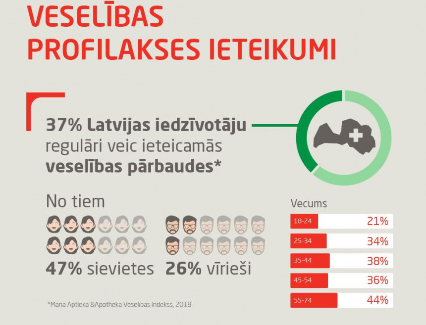 Latvijā 37 % sabiedrības regulāri veic ieteicamās veselības pārbaudes, liecina jaunākais “Mana Aptieka & Apotheka Veselības indekss”. Salīdzinot ar pagājušo gadu, par 3% pieaudzis to cilvēku skaits, kuri regulāri veic ieteicamās veselības pārbaudes – eksperti norāda, ka situācija uzlabojas, taču joprojām pārlieku daudzi cilvēki riskē ar savu veselību, vēršoties pie ārsta tikai tad, kad radušās veselības problēmas.