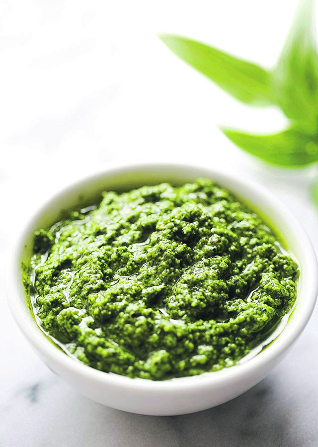 Visu sablenderē, pesto gatavs. To var lietot kā pastēti uz maizes, var pievienot sautējumiem, dažādiem makaronu un rīsu ēdieniem. Šādam pesto var pievienot arī citus zaļumus - rukolu, dilles, baziliku…