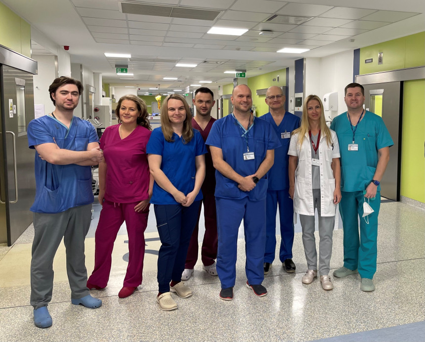 Traumatoloģijas un ortopēdijas klīnikas traumatologs ortopēds Konstantīns Plotņikovs un ķirurģijas ceturtā gada rezidents traumatologa ortopēda specializācijā Vladislavs Nikolajs Makovskis veica pacienta augšstilba lūzuma fiksāciju ar intramedulāro metāla stieni.