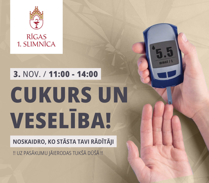 Atzīmējot Pasaules diabēta dienu (14. novembrī), 3. novembrī Rīgas 1. slimnīcā notiks bezmaksas cukura diabēta pārbaudes diena. Ar šo pasākumu slimnīca vēlas pievērst sabiedrības uzmanību cukura diabētam, tā profilaksei un savlaicīgai diagnostikai, kā arī atgādināt, cik svarīgi ir vismaz reizi gadā veikt veselības pārbaudes un apmeklēt ārstu.