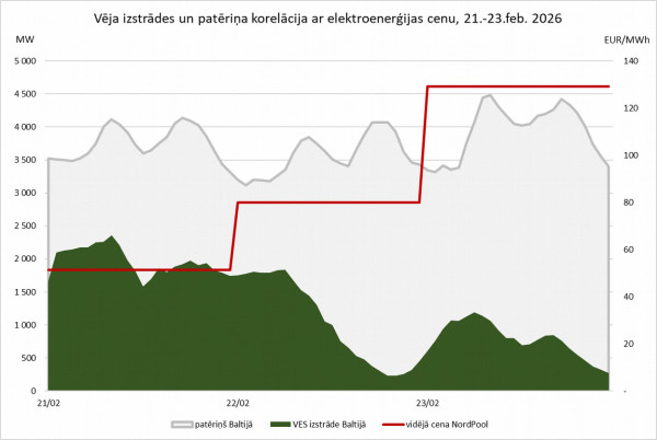 Gan Baltijas valstīs, gan arī Somijā un Zviedrijas 4. tirdzniecības apgabalā, kas ir savienots ar Lietuvu, februārī augstāku cenu pamatā ir zemāka atjaunīgo energoresursu izstrāde un paaugstinātais patēriņš saistībā ar zemo gaisa temperatūru, kā rezultātā vairāk elektroenerģijas ražošanā piedalījās un cenas noteica dārgākas fosilā kurināmā elektrostacijas.7