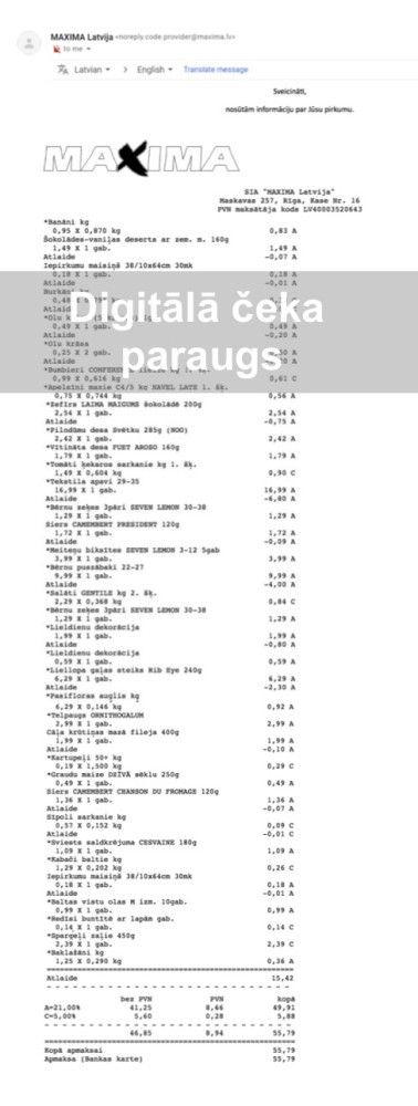 Rūpējoties par vides ilgtspēju, “Maxima” ir uzsākusi pakāpenisku pirkuma čeku digitalizāciju, kas jau uz gada otro pusi sniegs iespēju klientiem izvēlēties – saņemt čeku digitālā vai papīra formātā. Patlaban kases čeku izsniegšana digitālā formātā noris testēšanas pirmajā fāzē, kas šobrīd pieejama “Maxima” mobilās lietotnes lietotājiem, kuriem testa čeka digitālā versija tiek automātiski nosūtīta uz “Paldies” kartes kontā norādīto e-pastu, kā arī pieejama mobilajā lietotnē.